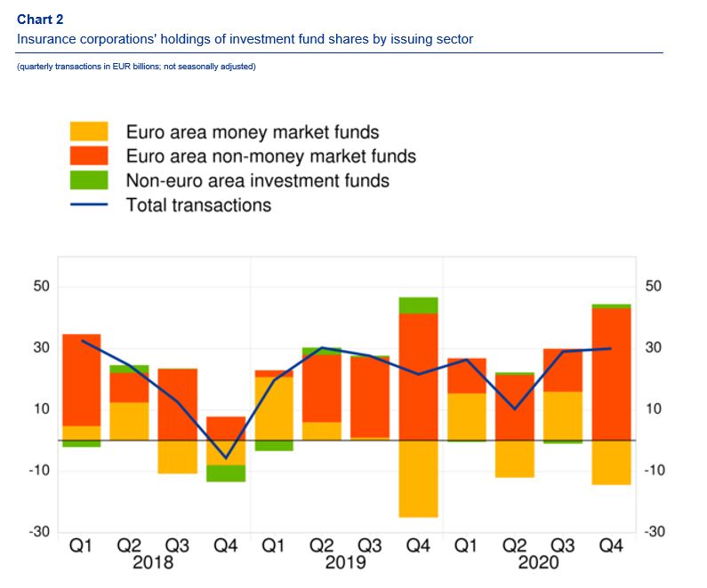 Turning to insurance corporations’ holdings of investment fund shares, these increased to €2,467 billion in the fourth quarter of 2020, from €2,360 billion in the previous quarter, with net purchases of €30 billion and price and other changes of €77 billion (see Chart 2). The year-on-year growth rate in the fourth quarter of 2020 was 4.2%.