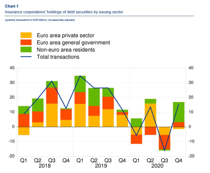 Looking at holdings by issuing sector, the annual growth rate of debt securities issued by euro area general government was -1.1% in the fourth quarter of 2020, with net purchases in the quarter amounting to €3 billion. As regards debt securities issued by the private sector, the annual growth rate was 0.4%, and quarterly net sales amounted to €1 billion. For debt securities issued by non-euro area residents, the annual growth rate was 3.1%, with quarterly net purchases of €14 billion.